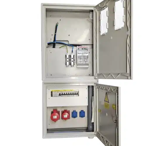 Gradilišni ormarić za struju OPP-3 za trofazno brojilo i uklopni sat, opremljen potrebnim osiguračima i fid sklopkom. Gradilišni ormar dolazi s industrijskim utičnicama 5polnim od 32A i 16A te schuko utičnicama od 16A.