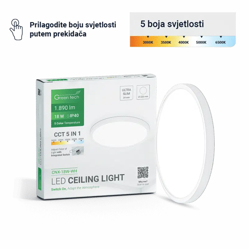 LED plafonjera Green Tech 24W 5 CCT 3000K-3500K-4000K-5000K-6500K, Ø 40 cm bijela