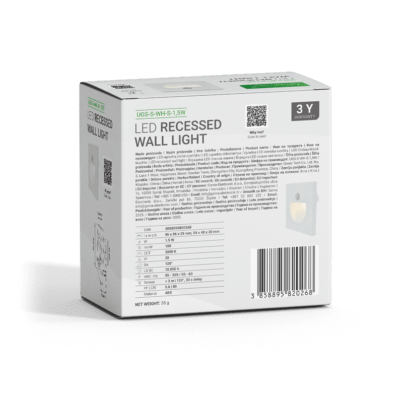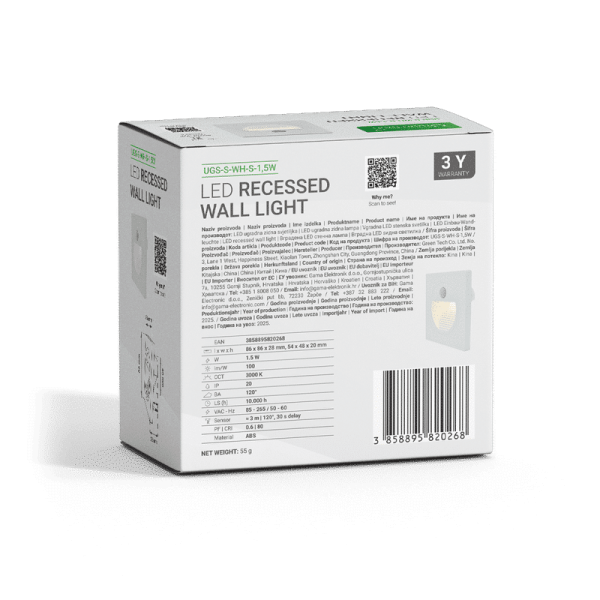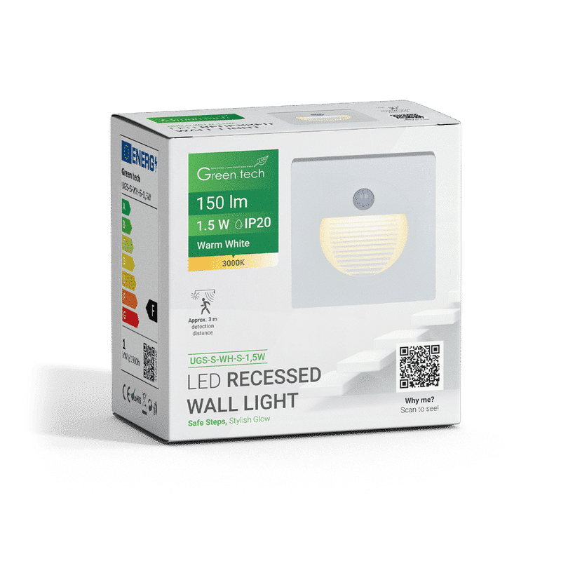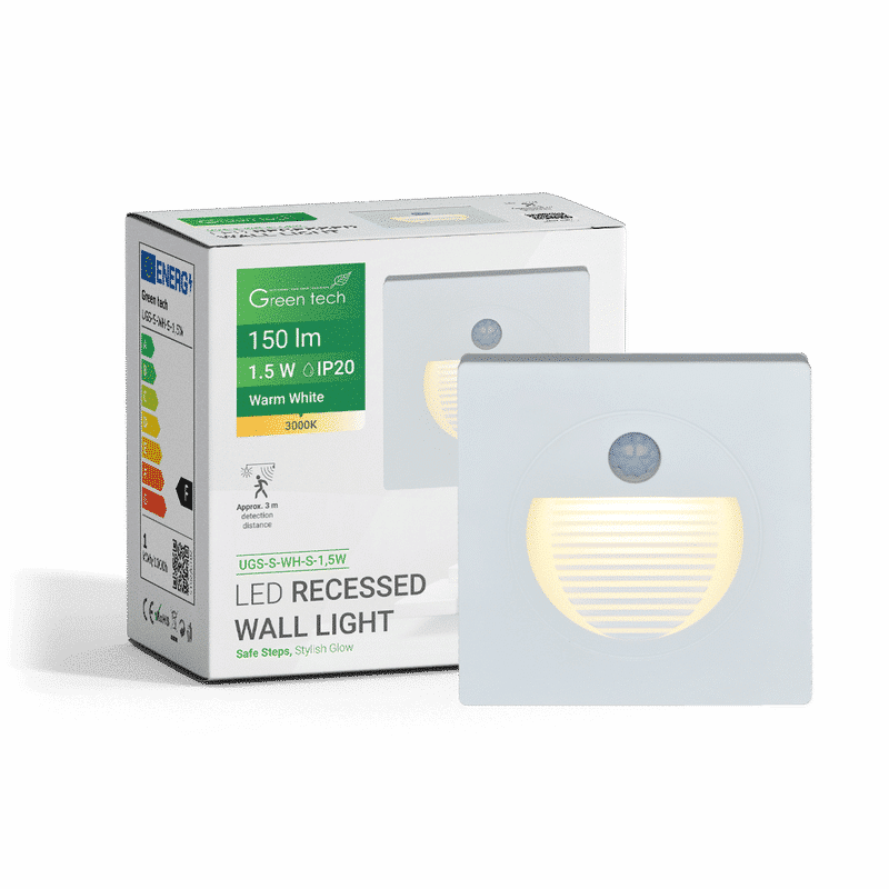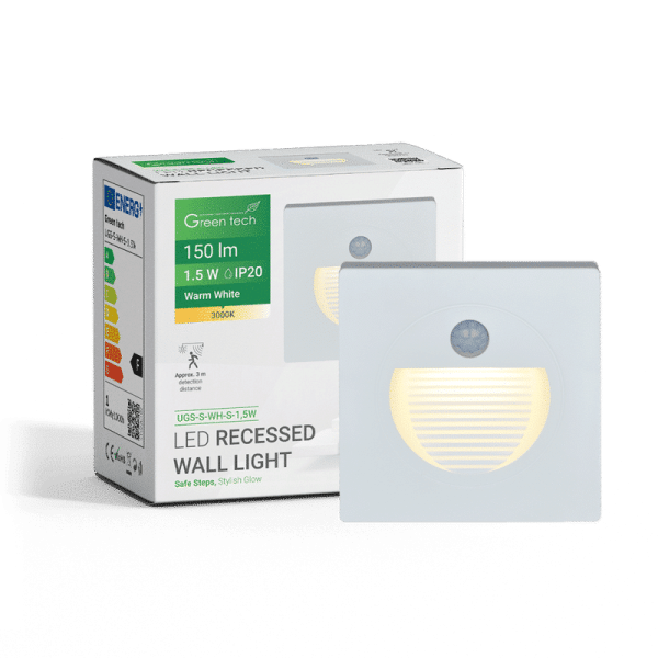 LED UGRADNA ZIDNA SVJETILJKA SA SENZOROM GREEN TECH 1,5W 3000K IP20 BIJELA