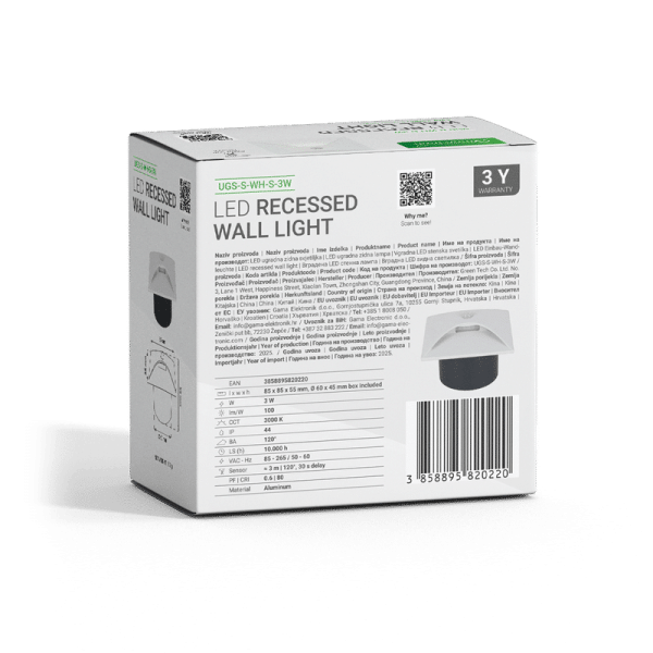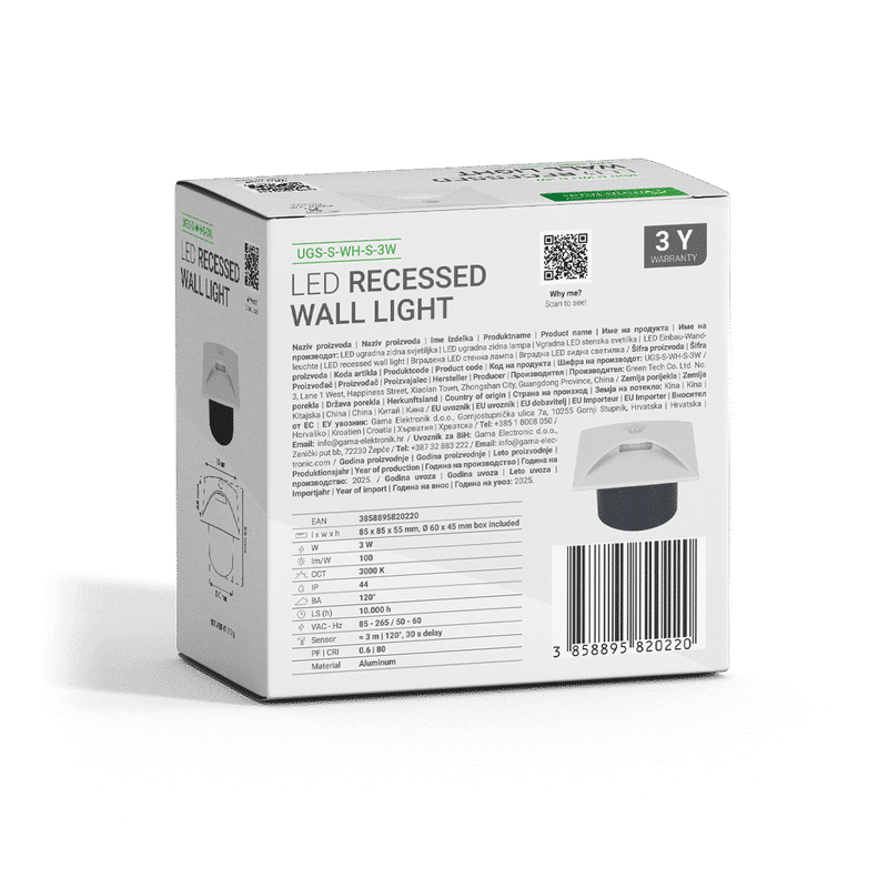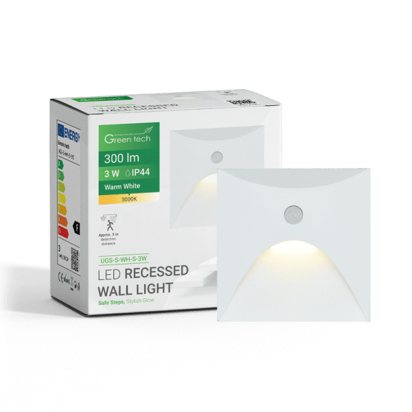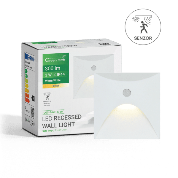 LED UGRADNA ZIDNA SVJETILJKA SA SENZOROM GREEN TECH 3W 3000K IP44 BIJELA