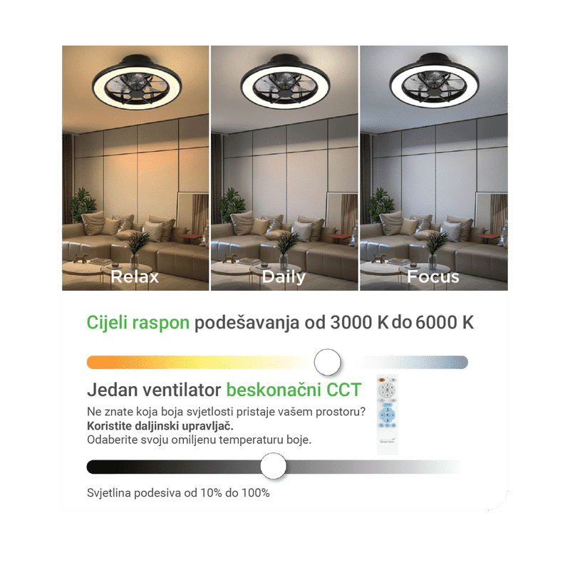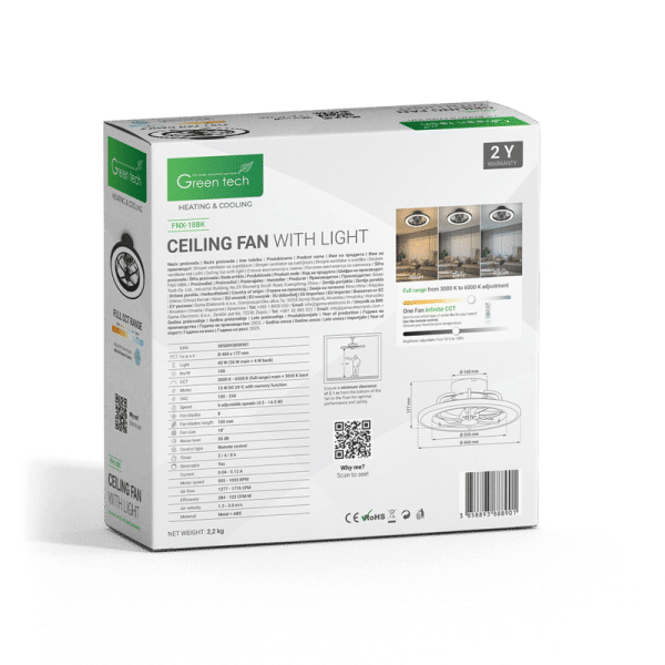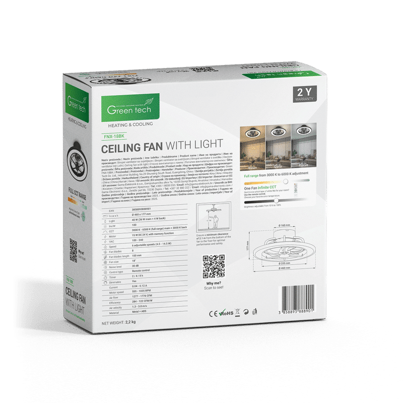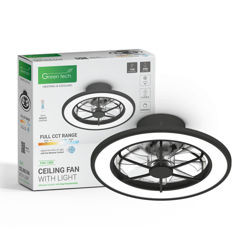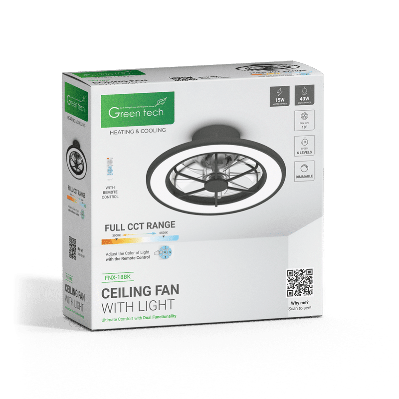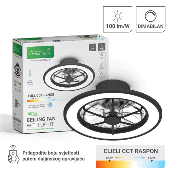 GREEN TECH Stropni ventilator sa svjetiljkom Green Tech, 18″, 40W, 3CCT, crni – FNX-18BK