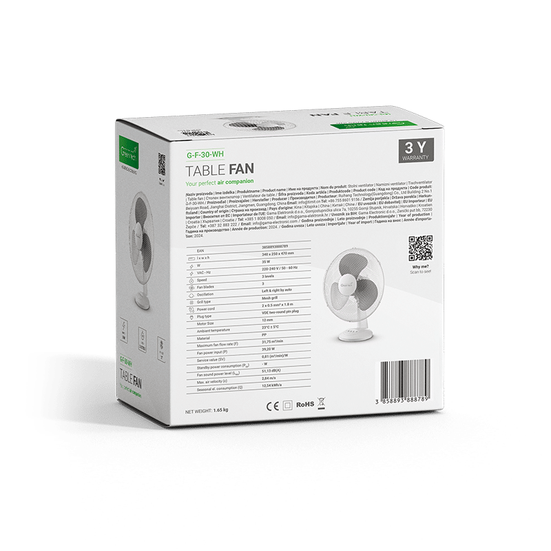 GREEN TECH Ventilator stolni Green Tech 35W, 12“, bijela boja – G-F-30-WH