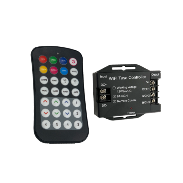 Green Tech LED kontroler Tuya RGB omogućuje upravljanje LED rasvjetom putem mobilne aplikacije ili glasovnih naredbi. Podržava napone od 12V do 24V, s maksimalnom snagom od 288W na 12V i 576W na 24V. Dizajniran je za “common anode” konfiguraciju, pružajući fleksibilnost u kontroli boje i svjetline.