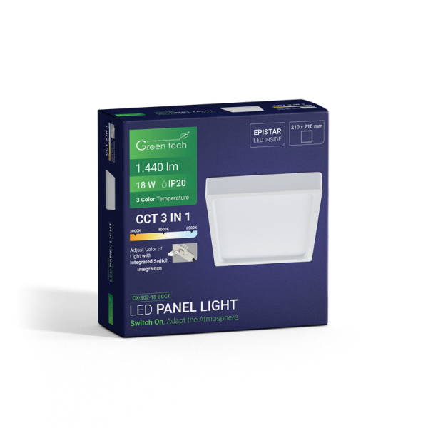 Green Tech LED panel snage 18W pruža mogućnost izbora između tri boje svjetlosti (3000K, 4000K, 6000K), boju svjetlosti birate pomoću prekidača integriranog na poleđinu panela. Njegov kvadratni, nadgradni dizajn omogućava jednostavnu instalaciju, dok se visoka energetska učinkovitost kombinira s modernim izgledom. Što ga čini univerzalnim izvorom svjetlosti za razne prostore. Prikladan je za montažu u uredske, poslovne ali i stambene prostore.