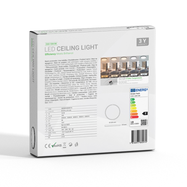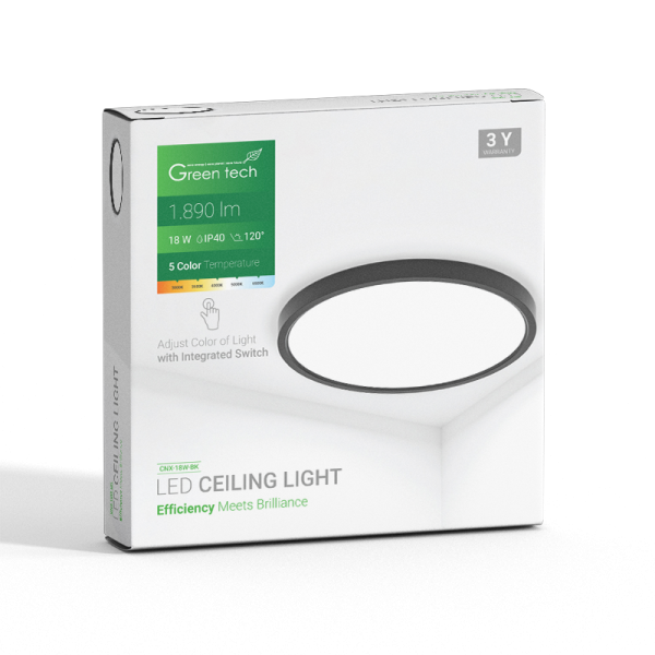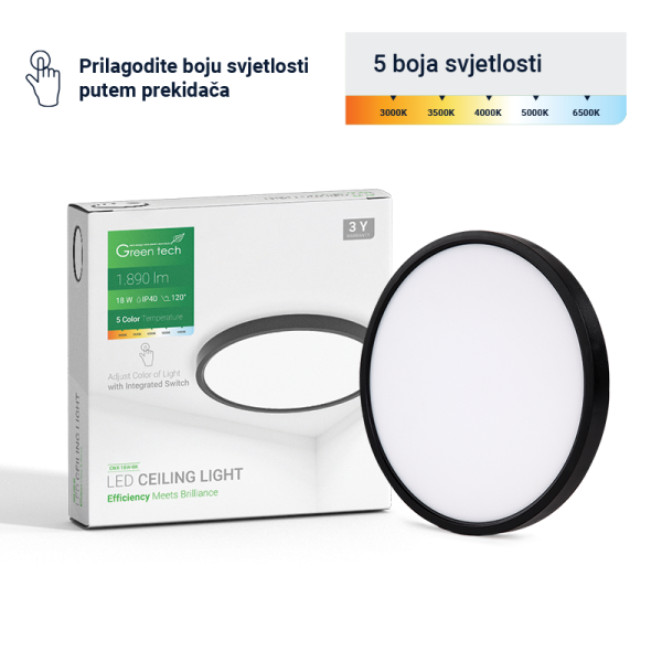 LED plafonjera Green Tech 18W 5 CCT 3000K-3500K-4000K-5000K-6500K, Ø 22 cm crna