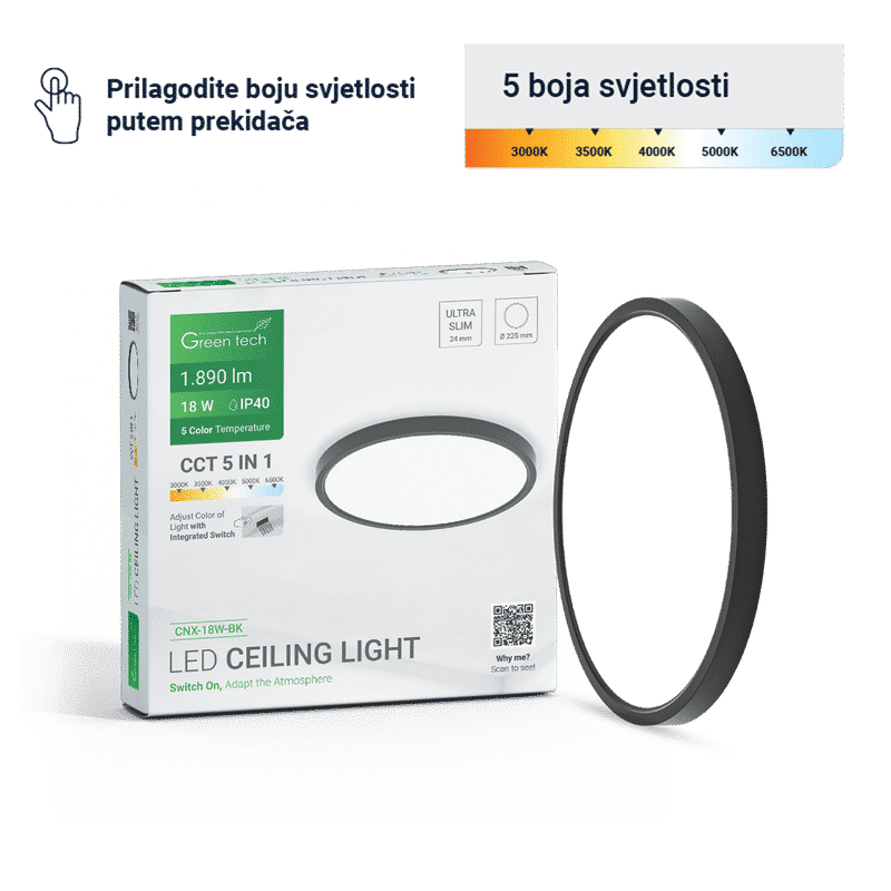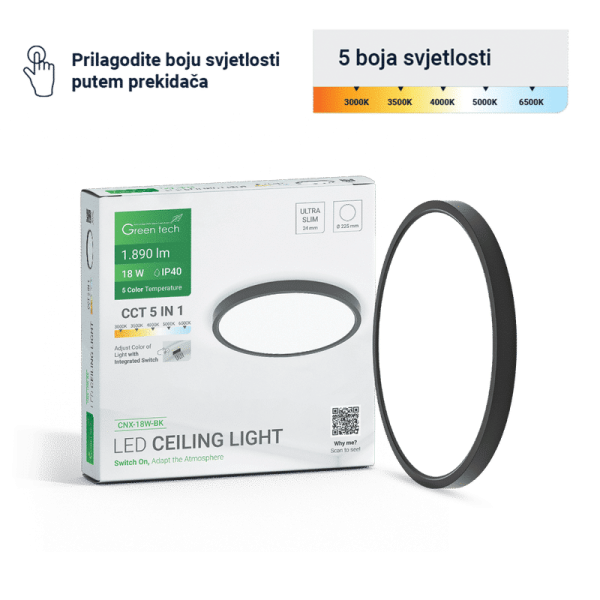 LED plafonjera Green Tech 18W 5 CCT 3000K-3500K-4000K-5000K-6500K, Ø 22 cm crna