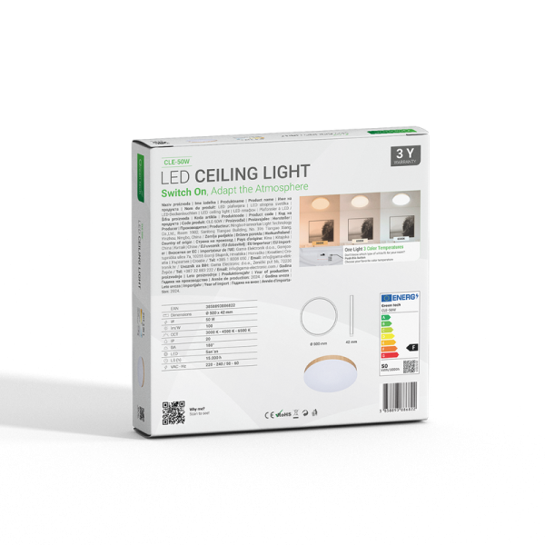 LED plafonjera Green Tech s drvenim okvirom kombinira moderan dizajn i prirodni izgled. S tri temperature boje (3000K, 4000K, 6000K) i snagom od 50W, idealna je za osvjetljavanje različitih prostora. Promjer od 50 cm omogućava ravnomjerno svjetlo, pogodno za dnevne boravke, blagovaonice i urede.
