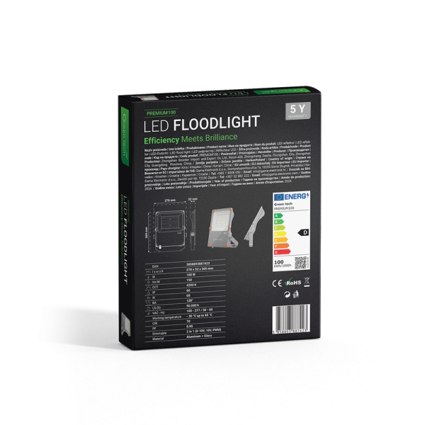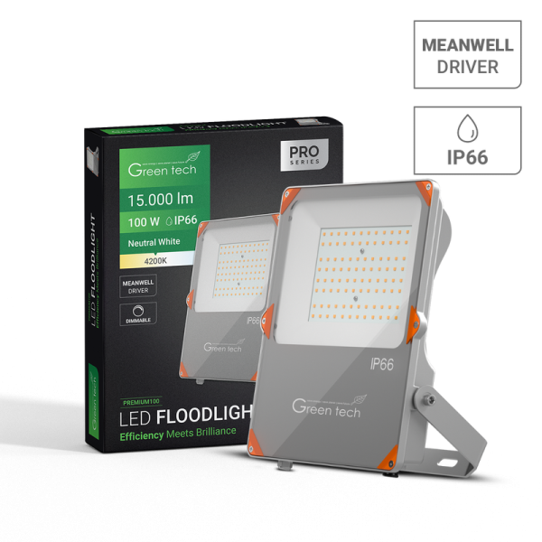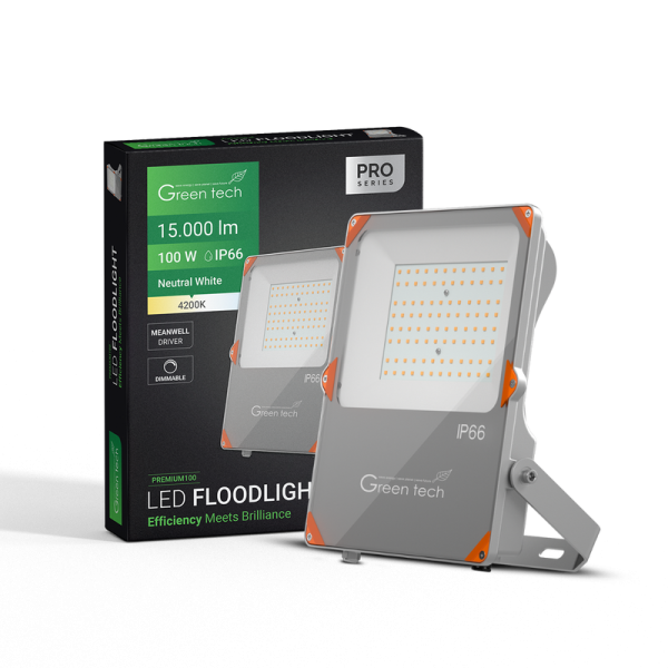 Green Tech premium LED reflektor snage 100W pruža visoku učinkovitost od 150lm/W i neutralnu bijelu svjetlost (4200K). Sa zaštitom IP66, reflektor je iznimno otporan na prašinu i vodu, čineći ga idealnim za vanjsku upotrebu u zahtjevnim uvjetima. Opremljen je pouzdanim Meanwell XLG napajanjem, što garantira dugovječnost i stabilnost u radu.