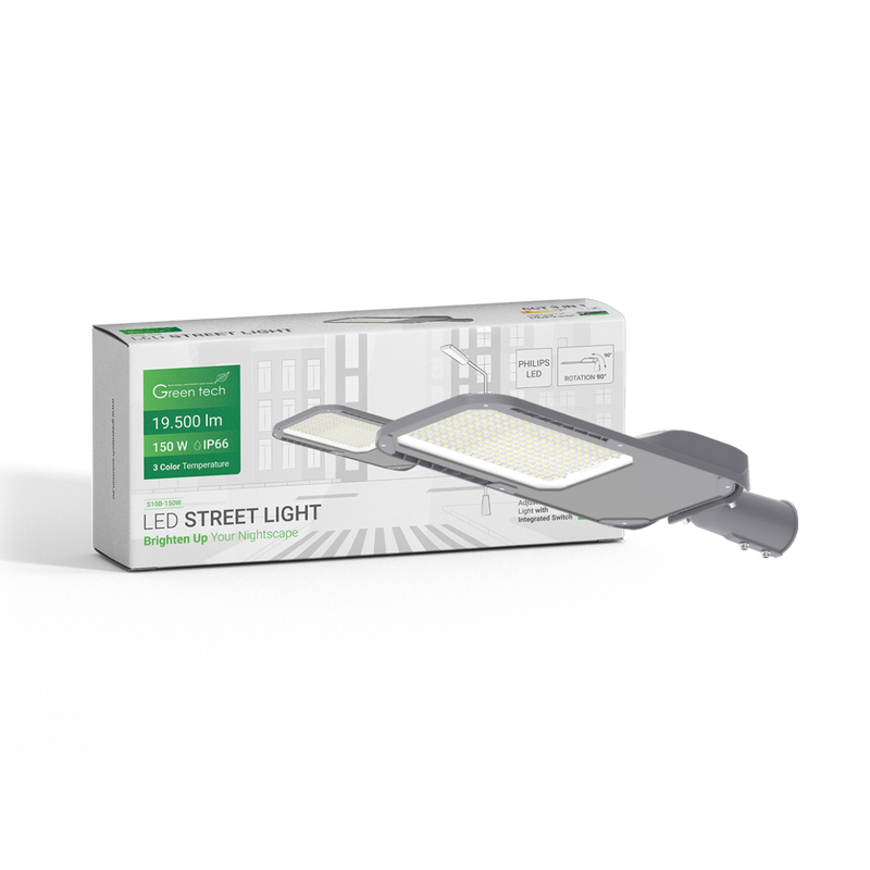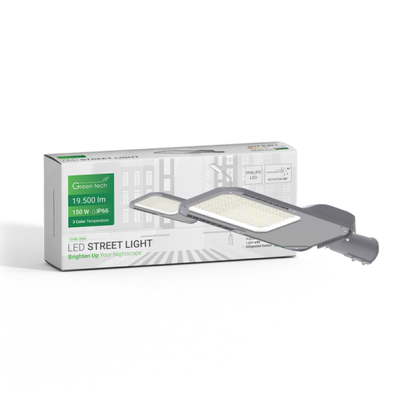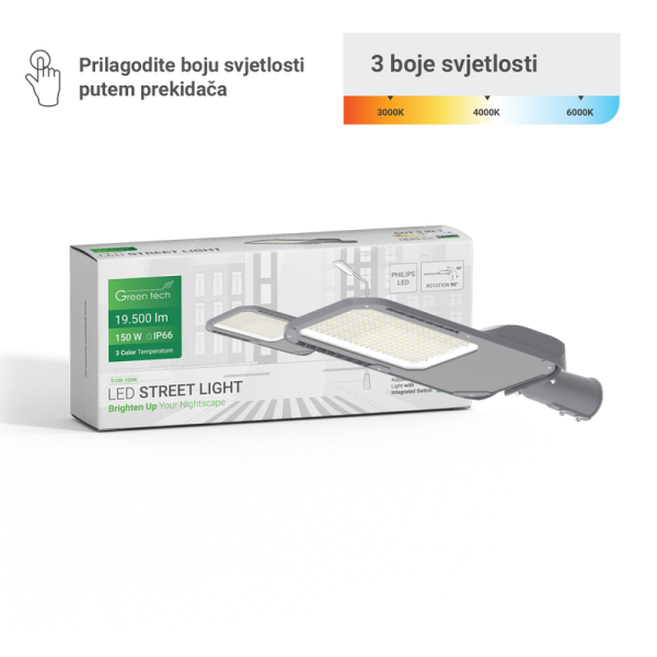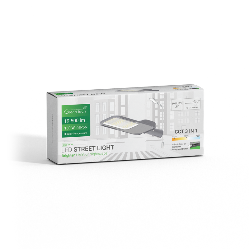 Ova LED ulična svjetiljka Green Tech snage 150W i svjetlosnog toka 19500 lm koristi visokokvalitetne Philips LED diode. Nudi prilagodbu boje svjetla (3CCT: 3000K, 4000K i 6000K), čineći je pogodnom za razne vanjske primjene. Snažna je, energetski učinkovita i izdržljiva, idealna za osvjetljavanje prometnica, parkirališta ili javnih prostora.