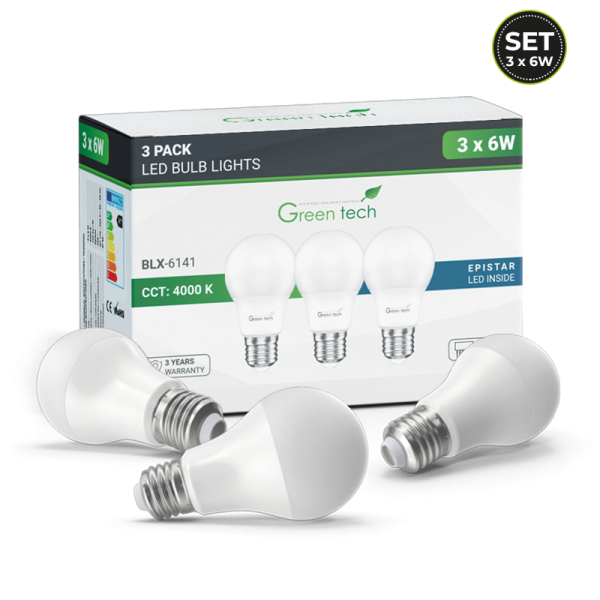 LED žarulje set sadrži tri led žarulje sa standardnim grlom e27 snage 6W. Žarulje su namijenjene za primjenu u kućanstvima ali i ostalim prostorima. Boja svjetlosti žarulja je neutralno bijela (4000k), a svjetlosni tok 600LM.