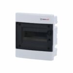 Podžbukni razvodni ormar za 8 mjesta izrađen od visoko kvalitetnih ABS materijala. Ormar je bijele boje dok su prednja vrata zatamljeno prozirna. Razvodni ormar postavlja se za razvod električne instalacije u kućanstvima ali i manjim industrijskim pogonima.