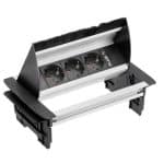 Ugradbena utičnica s mogućnošću poklapanja dok su kabeli ukopčani u nju. Konzola je opremljena s 3 schuko utičnice i izrađena od visokokvalitetnih materijala u sivoj boji.