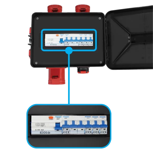 - Raznovrsna utična mjesta: Opremljen je sa 2x industrijske 5p 16 A utičnice, 1x 5p 32 A utičnicom i 5x Schuko 16 A utičnica, što omogućava priključivanje različite opreme.