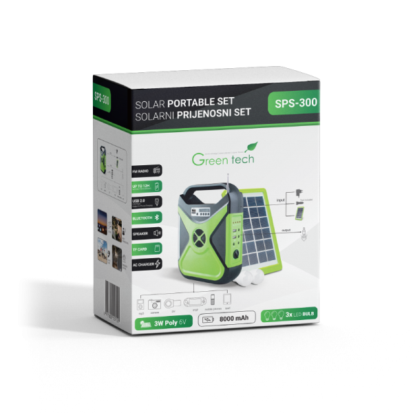 Solarni set s integriranim FM prijemnikom za reproduciranje najdražih radio stanica. Osim fm prijemnika ovaj solarni set može reproducirati glazbu s Vašeg mobilnog uređaja putem bluetooth spajanja. Ovaj set može puniti Vaš mobilni uređaj putem usb porta te može osvijetliti Vaš prostor s 3 žarulje od 3W koje dolaze u pakiranju. Kad sve silne funkcije isprazne bateriju kapaciteta 8000mAh, a to može potrajati i do 12h set napunite pomoću solarnog panela 3W poly 6v ili prikapčanjem na naponsku mrežu pomoću adaptera koji je također u pakiranju.