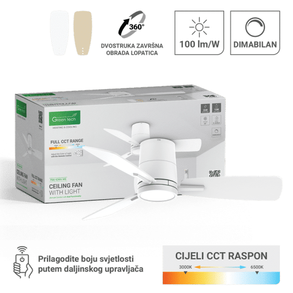 Stropni ventilator sa rasvjetom Green Tech, 42″ 15W 3CCT, Bijelo ili Drvo