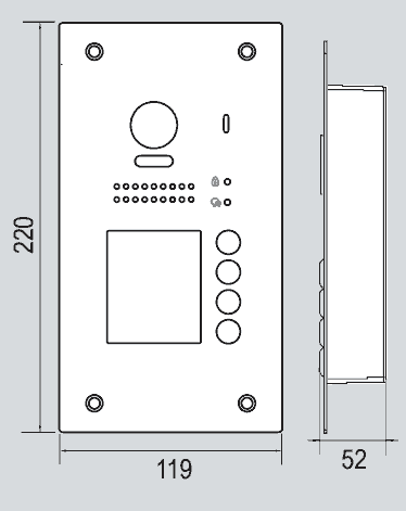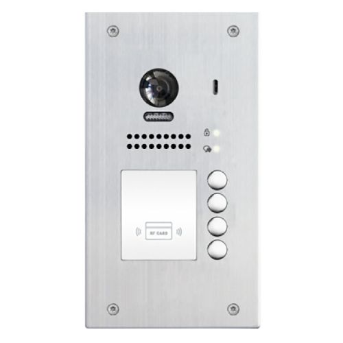 Vtek vanjska jedinica s četiri pozivne tipke za podžbuknu montažu. Opremljena sa Sony color kamerom s kutom snimanja od 170°. Vanjska jedinica s antivandal premazom opremljena je i čitačem EM kartica. Stupanj zaštite je ip 54 što je prikladno za vanjsku upotrebu.