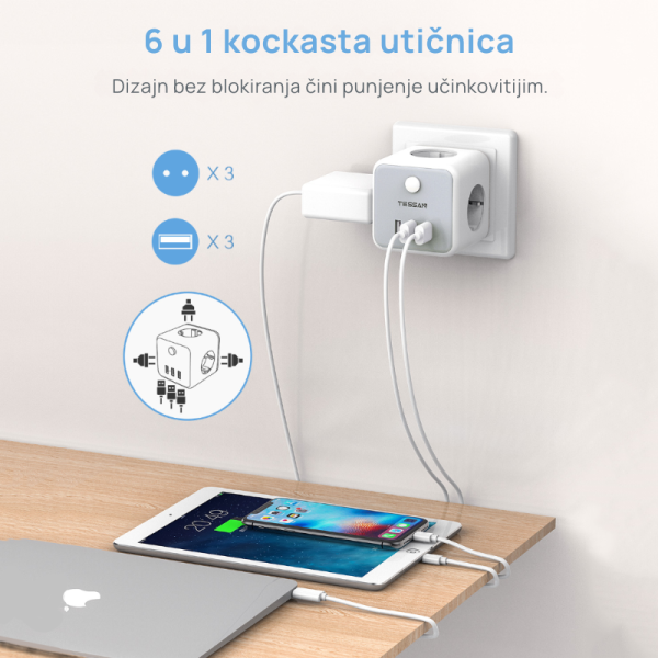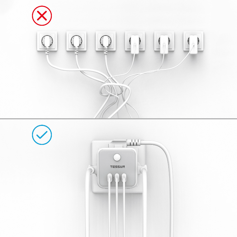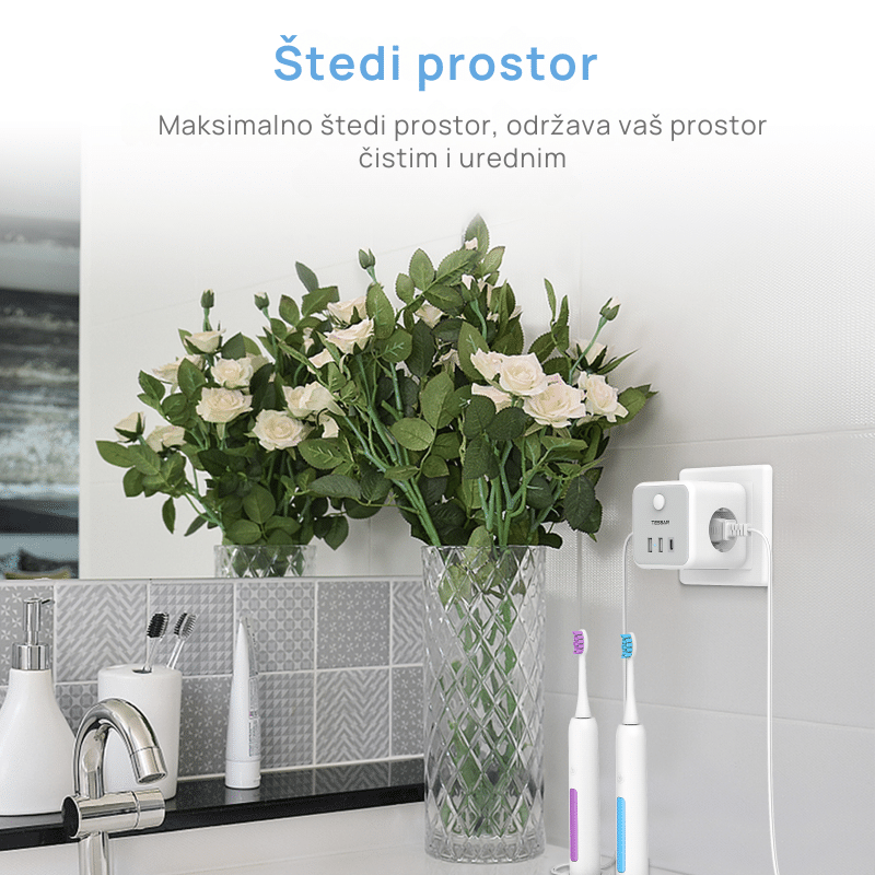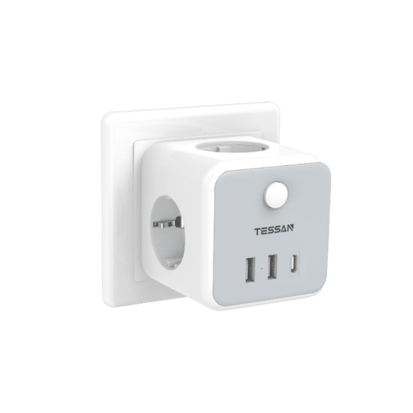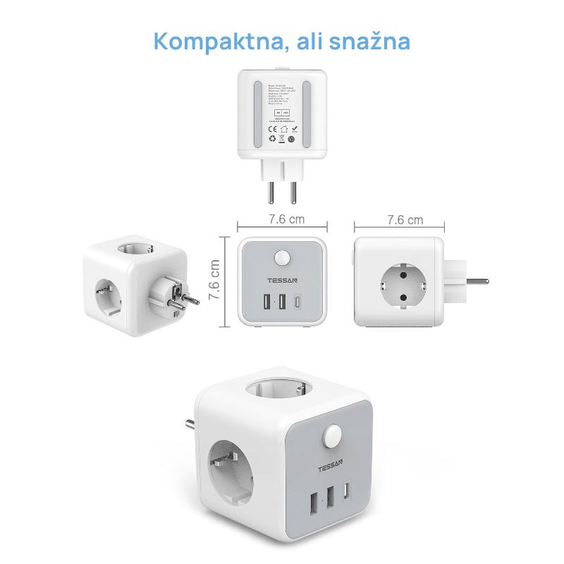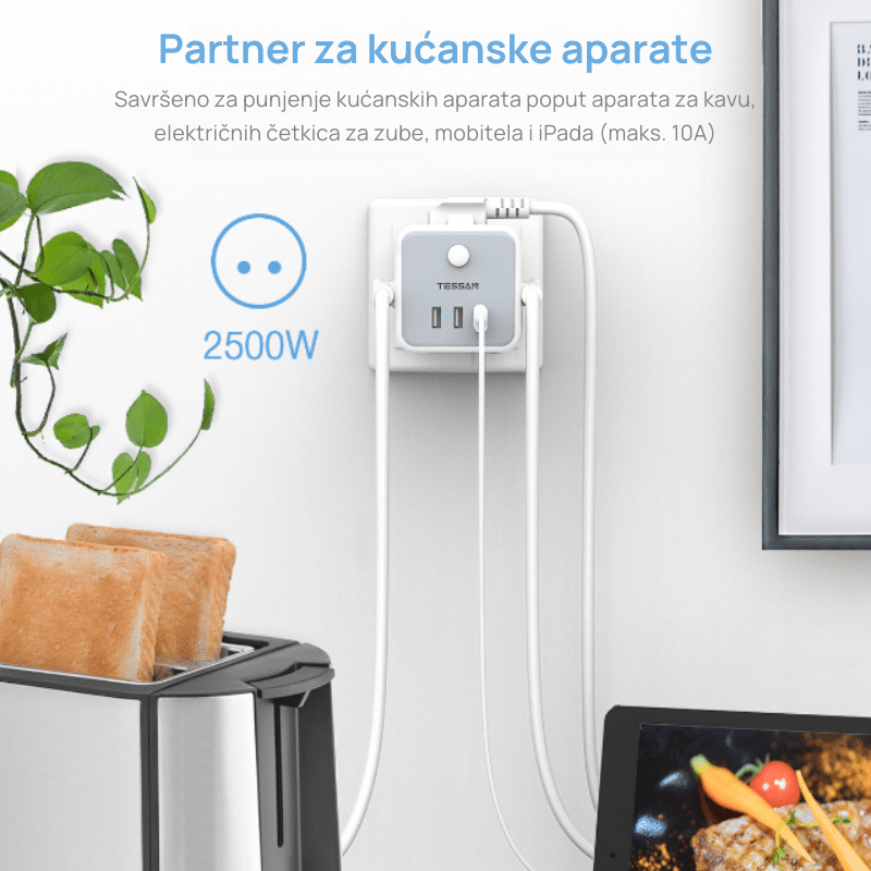 Zidna utičnica izrađena od ABS-a s PC vatrootpornim materijalom, snage 2500W/10A pri 220-250V, opremljen s 3 AC utičnice, 2 USB-A porta (5V/2,4A svaki), 1 USB-C port (5V/3A), ukupni DC izlaz 15W i prekidačem za jednostavno upravljanje