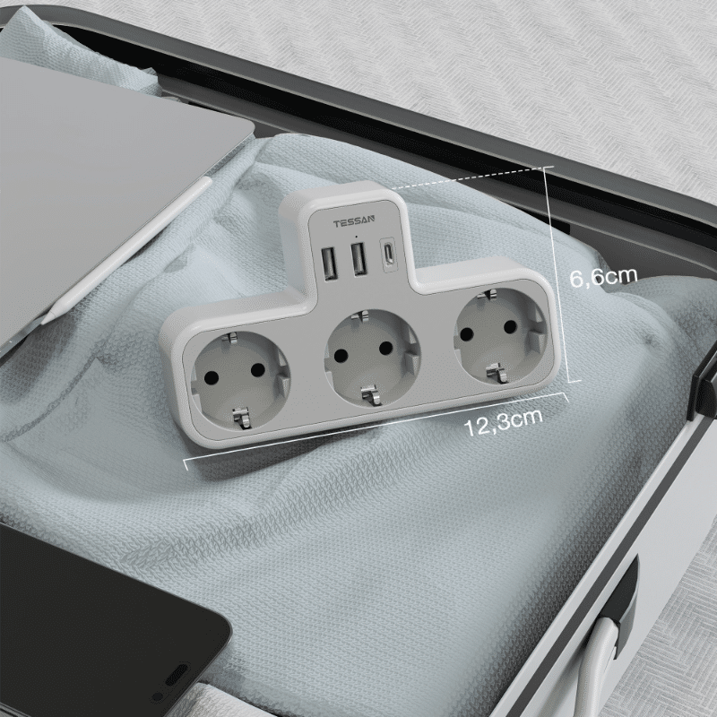 Zidna utičnica izrađena od ABS-a s PC vatrootpornim materijalom, snage 3600W/16A pri 230V, s 3 AC utičnice, 2 USB-A porta (5V/2,4A svaki), 1 USB-C port (5V/3A), ukupni DC izlaz 15W, prikladan za istovremeno napajanje više uređaja kod kuće, u uredu ili na putovanju