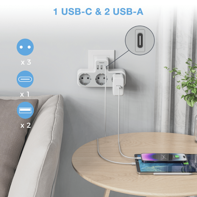ZIDNA UTIČNICA TESSAN TS-323-C 3 x ŠUKO 2 x USB-A 1 x USB-C
